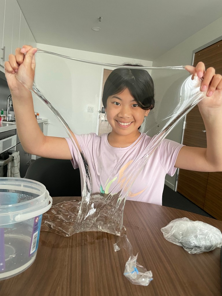 After 1st infusion in armDuring 2nd infusion. She did it herself. The blue pump is hanging on her side. She bought her own “Elmers Gue”, which she rates very well as a very good clear slime.